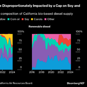 彭博新能源财经跟踪的已宣布项目表明,2024年至2028年(届时拟议的上限将生效),美国可再生柴油产能预计将再增长30%。目前,鉴于加州生物柴油供应中大豆和菜籽油的比例远超20%,拟议的上限和蓬勃发展的可再生柴油市场只会增加生物柴油的现有压力。