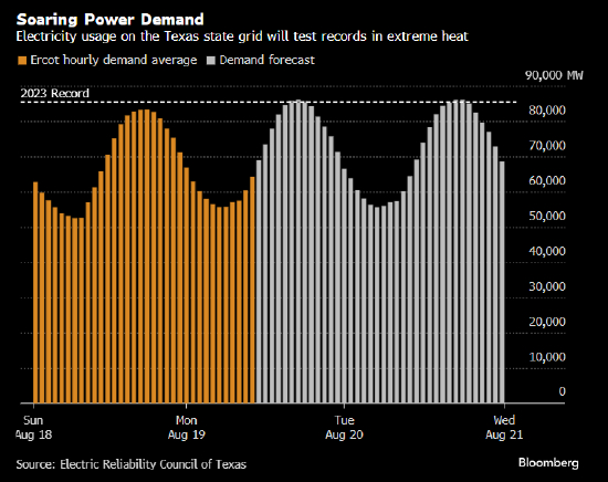 德州电网运营商称,截至周一下午5点用电量可能达到86吉瓦(86,000兆瓦),而周二也将再次试探这一水平。目前的最高纪录85.5吉瓦是去年8月所创。