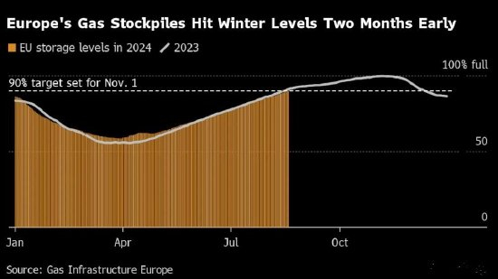 根据行业组织欧洲天然气基础设施(Gas Infrastructure Europe)的最新数据,8月19日,欧洲大陆的天然气储备水平达到了其容量的90%。这比欧盟设定的11月1日达到这一水平的目标早了两个多月。