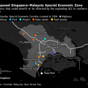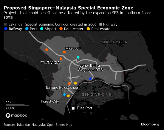 两国谈判代表正在努力敲定一项协议,拟在今年年底前将马来西亚南部柔佛州的部分地区划定为跨境经济特区。包括英伟达和万国数据在内的科技公司已然在投资料将在该协议下受益、扩张的数据中心园区。