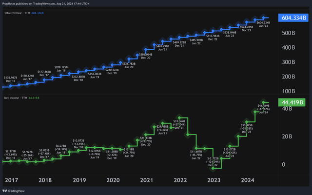 所有这些都带来了令人印象深刻的财务业绩,TTM收入超过6000亿美元,TTM净收入超过440亿美元-两个指标均创历史新高: