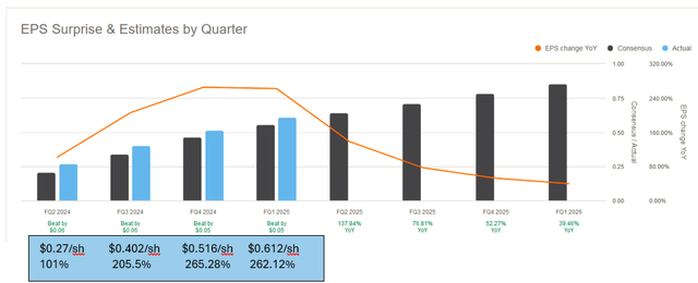更重要的是,周三公布的收益应为本季度的137%,与前两次收益相比,收益增长明显下降。2025年第三季度的每股收益增长率应进一步减速至76.81%,随后是2025年第四季度的52.27%收益增长率,然后是2026年第一季度的37.46%收益增长率。这种程度的收益减速应导致倍数大幅下降。