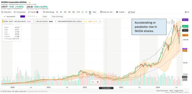 下图显示了英伟达从2023年7月到2024年6月的股价加速上涨。加速或抛物线式的价格上涨象征着市场高峰、泡沫和狂热,这些都发生在价格大幅下跌之前。