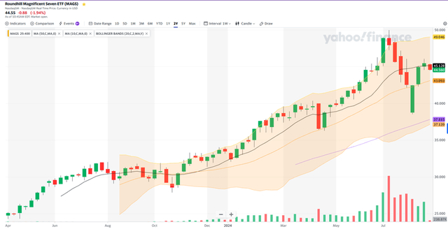 下面的Roundhill Magnificent Seven ETF(MAGS)图表显示,MAGS从4月到7月呈抛物线上升趋势,当时英伟达股价打破了加速上涨的势头。