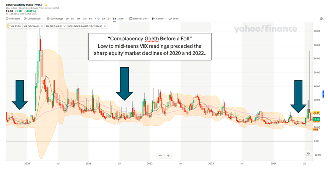 在下图的标准普尔波动率指数(VIX)中,我们观察到在2020年和2022年市场大幅下跌之前,VIX读数处于较低水平。今天的16.5低读数警告市场面临风险,而8月5日的大幅下跌则警告未来几个月和几个季度股市面临严重风险。