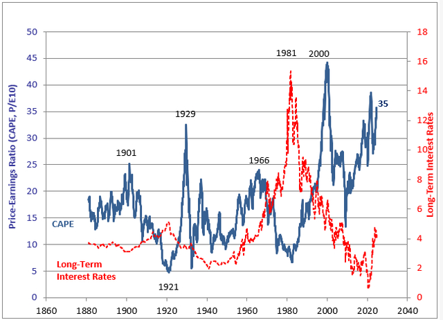下面的席勒周期调整市盈率模型显示,目前的CAPE为35,处于历史估值区间的高端,高于1929年的峰值,但低于2000年科技泡沫峰值和2020年前的峰值。35倍的市盈率很高。