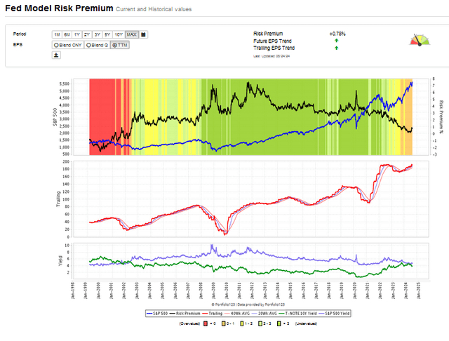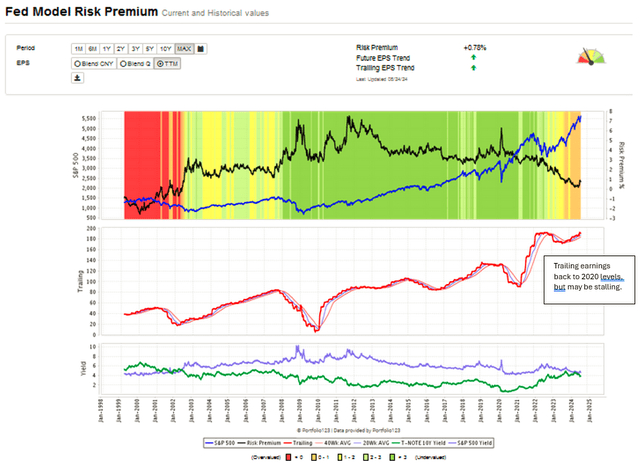 股票市场价格与收益密切相关,通常在收益上升时上涨。下图中过去12个月的收益图表自2022年标准普尔500指数下跌以来出现了强劲反弹。下图中的美联储模型风险溢价图表显示了中间窗格中红线中的收益。收益线最近开始超过2020年的水平,但最近几周这一上涨已开始暂停。