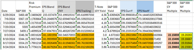 下面的数据集电子表格显示了标普500指数成分股的收益——过去十二个月,混合收益、当年收益和预期收益在过去三四周内停止增长。如果这些收益随着经济放缓而开始下降,标普500指数成分股可能会面临风险。标普过去四周的收益以警示黄色突出显示。