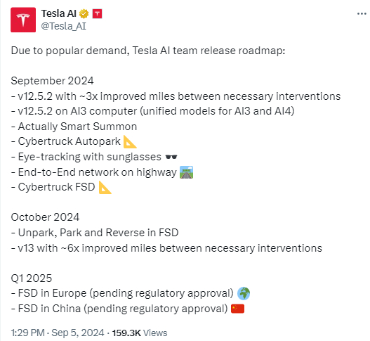这家电动汽车制造商旗下的Tesla AI周四在社交媒体X账号上贴出了发布路线图。
