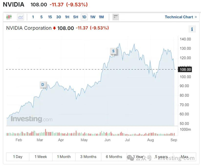 以近期英伟达(NVIDIA)(NASDAQ:NVDA)股价下跌为例。英伟达曾备受追捧,最近却大幅下跌。过去一年里,随着英伟达股价飙升,投资者纷纷涌入市场,但一有风吹草动就恐慌性地抛售,生怕泡沫破裂。这种行为正好印证了巴菲特的另一句名言: