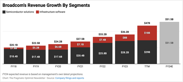 而从预期来看,博通的业务增长也将回归到合理水平。目前博通的营收来源主要分为两大部分:半导体解决方案和基础设施软件业务。其中半导体解决方案收入占比较大,超过50%,而基础设施软件业务自从收购了VMware后规模迅速扩大。