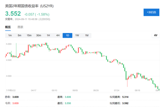 美国两年期国债收益率跌至2022年9月以来最低。
