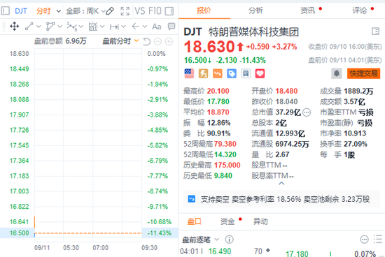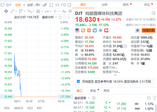 特朗普媒体科技集团美股盘前跌幅扩大至逾17%,今日哈里斯和特朗普举行首场电视辩论。