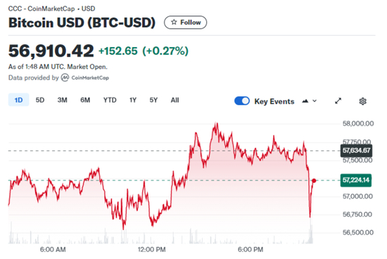 比特币盘中跳水后迅速回升,现涨0.27%,报5.69万美元/枚。