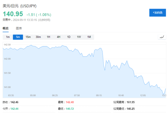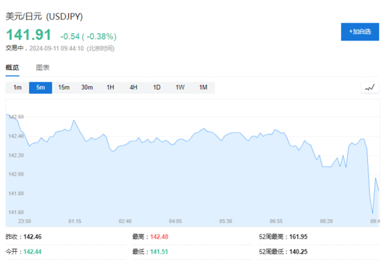 美元/日元短线下挫,现报141.91。