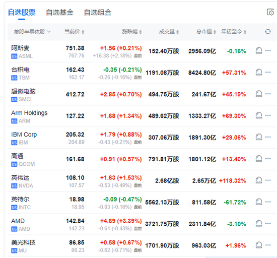 区块链概念股普跌,Coinbase Global跌逾2%,MARA Holdings跌逾3%。半导体股多数下跌,英伟达跌0.5%,美光科技跌0.7%。