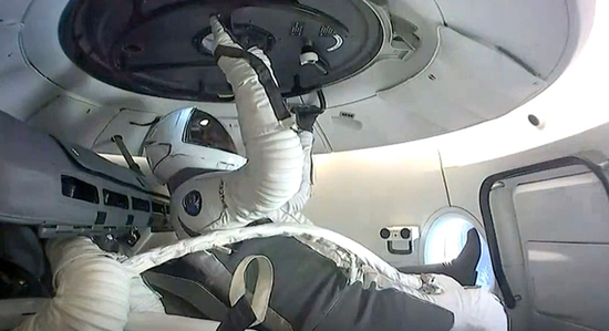 通过“天行者”(Skywalker)梯子,以及12英尺长的系绳,艾萨克曼率先走出太空舱,并在舱外待了10多分钟。随后,吉利斯出仓,同样在舱外待了10多分钟,以测试SpaceX宇航服的性能。