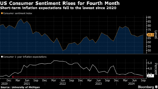 受益于降息前景以及2020年底以来最温和的短期通胀预期,9月初美国消费者信心指数升至四个月高位。