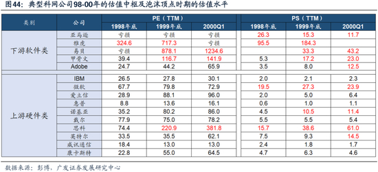 英特尔在99年以前的PE波动区间是8倍到20倍,而99年下半年以后开始突破20倍PE,最高点达到55倍;微软在99年以前的PE波动区间是17倍到30倍,而99年下半年以后也开始突破中枢,最高点超过80倍;思科估值高点突破200倍。