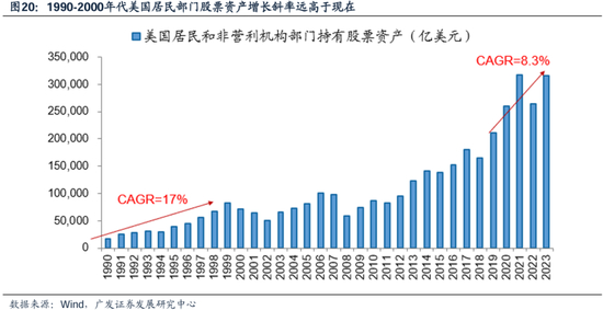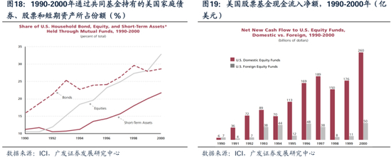 90年代大幅流入权益资产:美共同基金的规模扩张7倍,而权益基金规模扩张20倍。401k计划允许个人将部分工资投入股市,股票投资在居民资产配置中的地位上升、并超过了债券,美国居民通过共同基金持有的美股占比持续增长。
