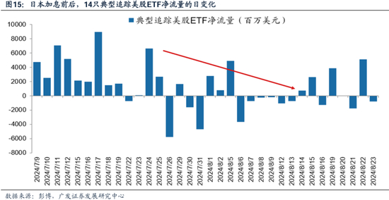 美股资金的持续流入趋势,是否会有阶段性的再均衡,是我们当下需要重点关注的变化。我们从美股市场上14个典型的、资产规模较大的美股ETF净流量变化来观察(包括宽基ETF和科技股ETF),7月上半月资金基本呈净流入状态,7月31日日本央行加息前后至8月上旬,资金开始转为流出。8月中旬之后,再度转向平稳。
