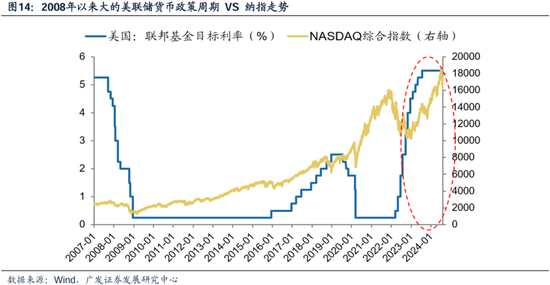 我们如果拉长周期来看,自09年至23年的一轮大的美联储紧缩周期,也是推动纳指不断上行的一轮大周期。2022-2023年的加息周期仅短暂地遏制了纳指上行的脚步,更多地是对美国相对强劲基本面及利率中枢的定价。