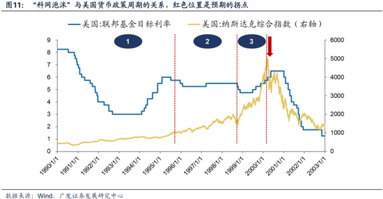 在货币政策收紧的前半阶段(2000年)却未能阻止泡沫膨胀的步伐,但加息转为降息的拐点(2000-2001)却对应了泡沫的高点。