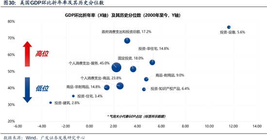 那么,往前看经济放缓的过程中,出现大起大落(显著衰退)的风险可能也就相对较小。在经济放缓的过程中,由于支撑项之间的交替作用,整体经济表现较为稳定,降低了出现显著衰退的风险。