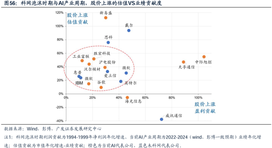 下图可见,科网时期(蓝色点)估值贡献度更大,当前AI时期(黄色点)业绩/估值贡献基本相当。