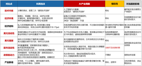 科网泡沫在酝酿过程中,美国的经济、政策、产业、技术背景,与当前的美股科技行情存在很大程度的相似性,也有局部的差别: