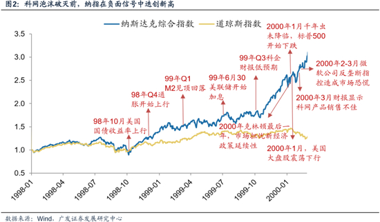 科网泡沫并非一日筑成,也并不是一下子破灭,自98年起一系列的负面信号都并未逆转泡沫最后的疯狂。
