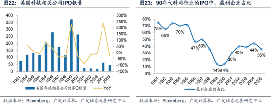 1995-2000年,平均每年有250家科技IPO融资,且实现盈利的公司占比较小、均实现了暴涨。1990年代,美股科技板块IPO融资规模激增。1998年至2000年三年时间里,美国科技板块相关的IPO数量达到744个,而在2000年之后的5年时间里,IPO总数仅为168家。