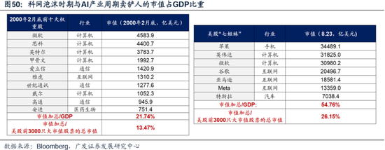 由于标的缺乏辐射和扩散,美股七姐妹的市值占比高于90s的科网巨头。2000年科网泡沫之前,纳斯达克十只市值占比最高的科技公司,市值占美国GDP的比重约22%;目前,美股七姐妹的市值占美国GDP的比重约51%。