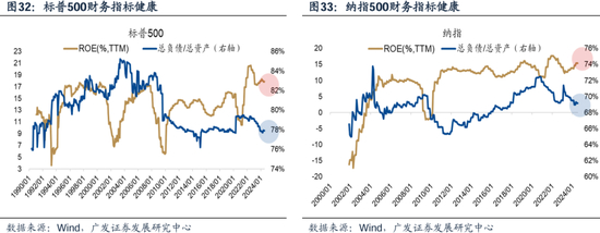 当前,标普500、纳指的ROE水平均位于历史高位,与此同时,负债率水平位于历史低位。