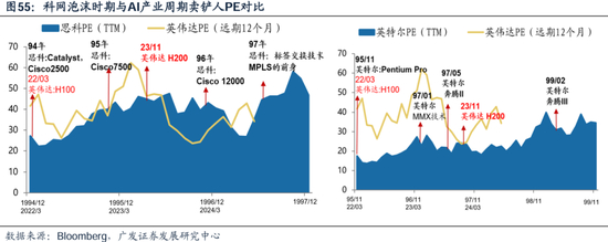 科网泡沫的前半段,尽管有革命性产品推出,硬件公司的估值水平依然稳定在30-40倍左右,而英伟达本轮估值确实上行更陡峭。