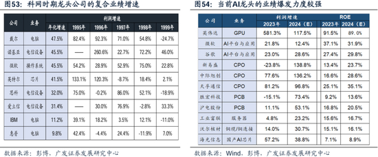 对标科网,本轮AI“卖铲人”业绩爆发力度更强,但与科网当时5年以上的复合高速增长相比,本轮的持续性暂且未知。当前AI产业A股与美股的核心标的,业绩已有爆发呈现,ROE亦处高位(不乏30%以上),但能否有持续的业绩爆发还需看到供给端的瓶颈突破、以及应用端及新的商业模式涌现带来的增量需求。