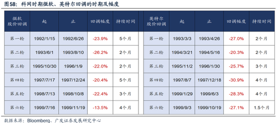 事实上,微软、英特尔等科网龙头,在90s主升浪过程中经常出现20-30%的股价回撤,科技龙头的股价高波折并不罕见。这些回撤的持续时间在2-5个月,回调幅度基本上在30%以内。