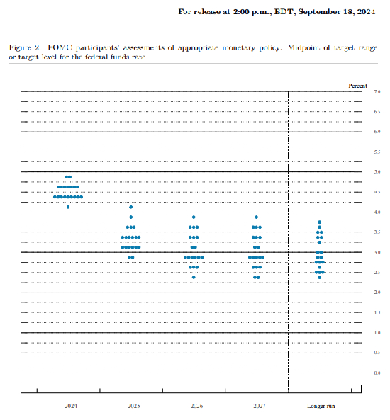 美联储主席鲍威尔说,根据美联储的预测,美联储并不急于放松政策。鲍威尔在新闻发布会上表示:“SEP(经济预测摘要)中没有任何迹象表明委员会急于完成这项工作。”“这个过程随着时间的推移而演变。”“点阵图”显示,19名联邦公开市场委员会成员(包括投票和不投票的成员)预计,到今年年底,基准联邦基金利率将保持在4.4%,相当于4.25%至4.5%的目标区间。美联储今年剩下的两次会议分别定于11月6日至7日和12月17日至18日举行。美联储预计,到2025年,利率将降至3.4%,这意味着利率将再次下调整整一个百分点。到2026年,利率预计将再次下调0.5个百分点,降至2.9%。