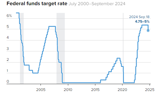 北京时间9月19日凌晨2点,美国联邦储备委员会宣布将联邦基金利率目标区间下调为4.75%至5%,即降息50个基点,这是美联储自2020年以来首次降息。自2022年3月至去年7月,美联储一年多时间连续11次加息,累计加息525个基点,自去年7月以来连续八次会议按兵不动,将政策利率保持在2001年来高位。