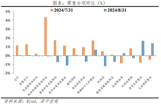 三是,零售小幅增长,消费仍在高位。8月零售销售总额环比0.1%,前值1.1%;核心零售销售0.2%,前值0.4%。机动车辆、无店铺零售、食品饮料是主要贡献项目,分别占零售总额的18.8%、11.8%和17.3%。具体来看,汽车销售额同比增长1.1%,环比增-0.1%;无店铺零售同比增7.8%,环比1.4%;食品饮料同比增1.6%,环比-0.7%。