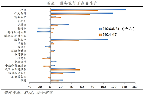 其中,服务好于商品生产,制造业是主要的拖累;服务生产新增就业10.8万人,商品生产增1.0万人,制造业拖累2.4万人。服务生产中,教育和保健服务新增就业4.7万人,休闲和酒店业4.6万人。商品生产中,建筑业新增就业3.4万人,耐用品下滑2.5万人。