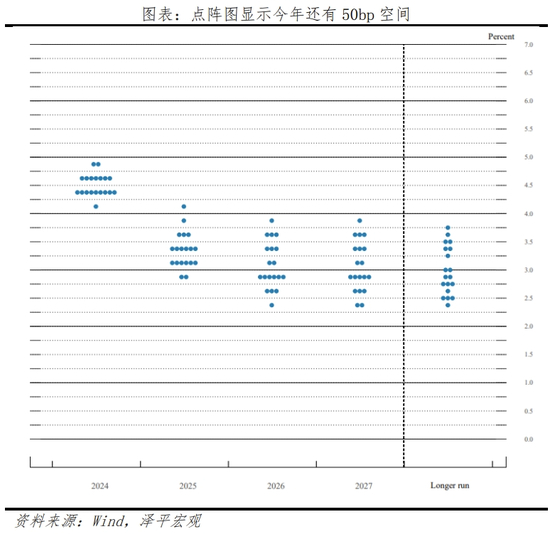 三是今年仍有50个基点的降息空间,但后续降息路径分歧较大。点阵图显示,2024年仍有50bp降息指引,对应联邦基金利率中值4.4%;2025年仍有100bp的降息空间。后续降息路径会根据数据、不断变化的前景和风险平衡来决定,并不会急于完成降息;节奏也会动态调整。