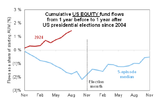 不过科技股未来可能仍会面临一些卖压。历史表明对冲基金通常会在大选等重大事件发生前平仓。高盛的数据显示,虽然今年也不例外,但他们的风险敞口仍然高于历史水平。这表明还有更多的抛售空间。