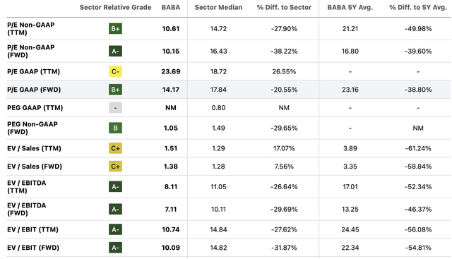 同时,根据 Seeking Alpha Quant 的数据,按今天的价格计算,阿里巴巴的每股收益、每股账面价值和每股自由现金流指标如下: