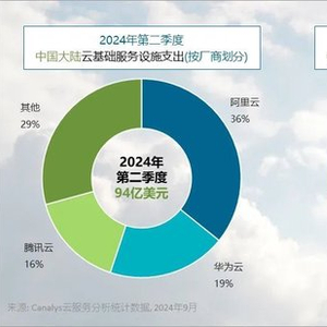 9 月 26 日消息,Canalys 今日发布报告,2024 年第二季度,中国大陆云基础设施服务支出达到 94 亿美元(当前约 660.73 亿元人民币),同比增长 8%。阿里云、华为云和腾讯云继续主导市场,共占 71% 的市场份额。