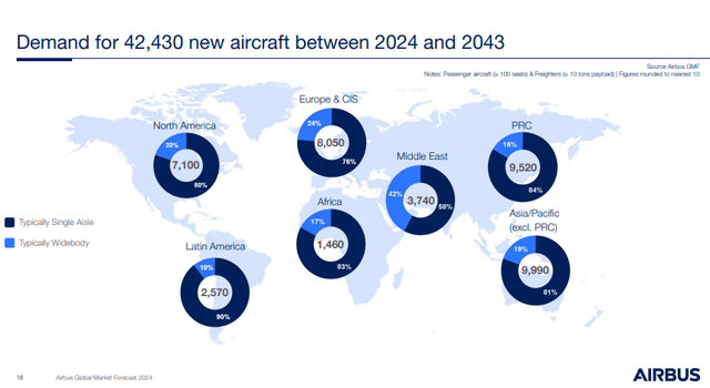 由于供应限制和需求增加,航空业继续面临运力不足的困境。根据空中客车公司 ( OTCPK:EADSF ) 最新的全球市场预测,对运力的需求可能会持续存在,预计 2024 年至 2027 年期间客运量将每年增长 8.4%;从 2027 年到 2043 年,客运量将继续以每年 3.6% 的速度增长。随着这些地区的经济不断成熟,预计亚洲和中东将主要做出贡献。此外,航空货运市场预计将从 2023 年的 2450 亿美元飙升至 2043 年的 5250 亿美元。总体而言,预计航空公司在 2024 年至 2043 年期间将需要额外的 42,000 架新飞机(即每年 2.200 架飞机)。