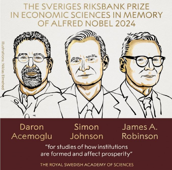 当地时间10月14日,瑞典皇家科学院宣布将2024年诺贝尔经济学奖授予三位美国经济学家——麻省理工学院的达隆·阿西莫格鲁(Daron Acemoglu)和西蒙·约翰逊(Simon Johnson),以及芝加哥大学的詹姆斯·罗宾逊(James A. Robinson),以表彰他们在关于制度如何形成并影响经济繁荣研究领域的突出贡献。