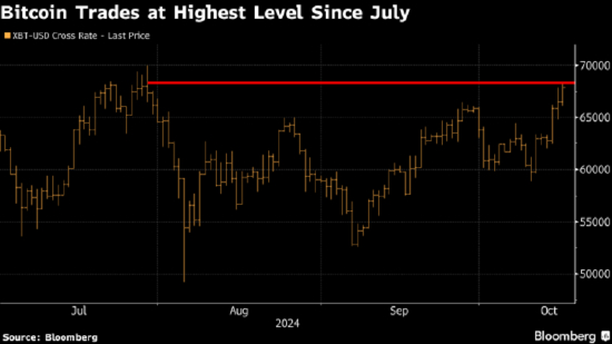 此外,由于特朗普展现了对加密货币的热情,10月初以来,比特币价格已上涨13%。周三,比特币价格一度突破68000美元,盘中大涨超3%,创下7月底以来的新高。