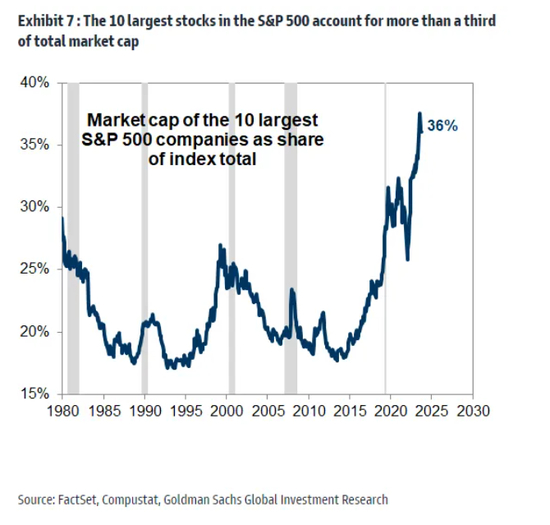 下图展示了自1980年以来,标普500指数中最大的10只股票所占的比例: