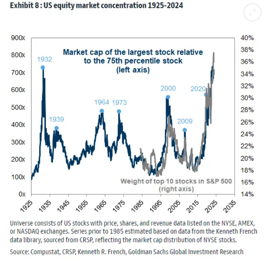 Kostin的另一张图表反映出,自1925年以来,最大股票与指数中处于第75百分位公司(比74%的公司规模更大)的比例。图中的峰值与重要的时刻重合,无论是买入(如1932年和2009年)还是卖出(如1973年和2000年)。一般来说,极端集中发生在经济低迷时,现在并非这种情况;或者市场极度兴奋的时候,如1973年的Nifty Fifty(指在1960年代末到1970年代初,美国股市中被广泛认可的50家增长稳定、业绩优良的大公司)和2000年的互联网泡沫: